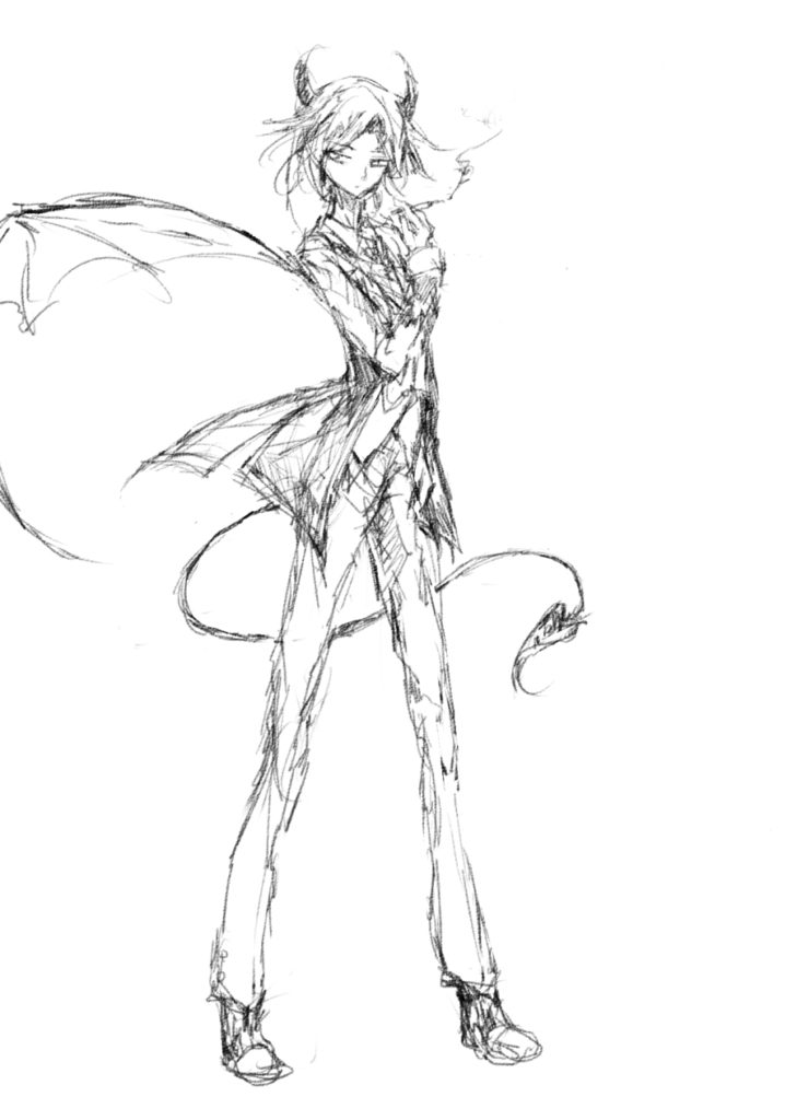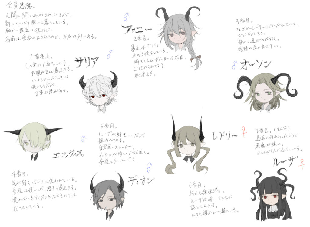 が、世界観を練っていた際に悪魔という存在が人間の延長になったので撤廃。悪魔とは呼ばれるが、想起されるような悪魔ではない、という事で。死人なので青白い肌(血の通った肉体は無いが)、それと赤い目という設定に。