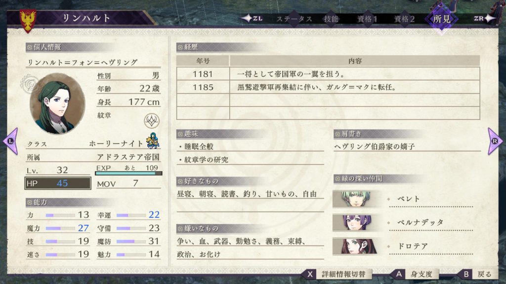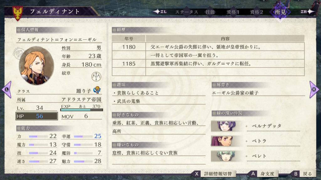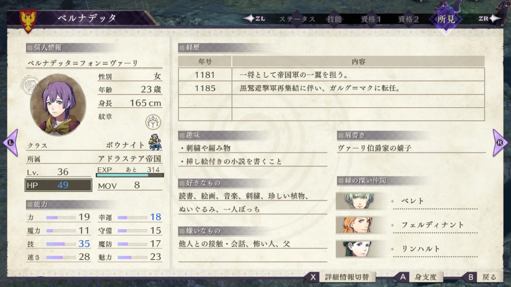 踊り子、旧作FEより移動範囲が大きい気がする、よってめちゃくちゃに使いやすかった。リブロー組で後方から手厚く回復させたり、ベルナデッタで遠くのペガサスを倒してもらったり、なんなら避けるし大体の攻撃一発は耐えるので前線のキャラを再行動させてもいい。大いに助かった。