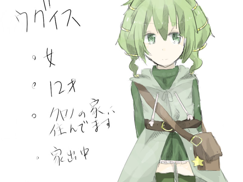 素直で可愛らしい家出少女、あまり過去は語りたくない様子だが二度と家には帰らないとは豪語している。ウグイスは偽名、家出と共に名前を捨てた。 よくクロノの手伝いをしており、物怖じしない。 「えっへん、どうですか?花を植えてみ …