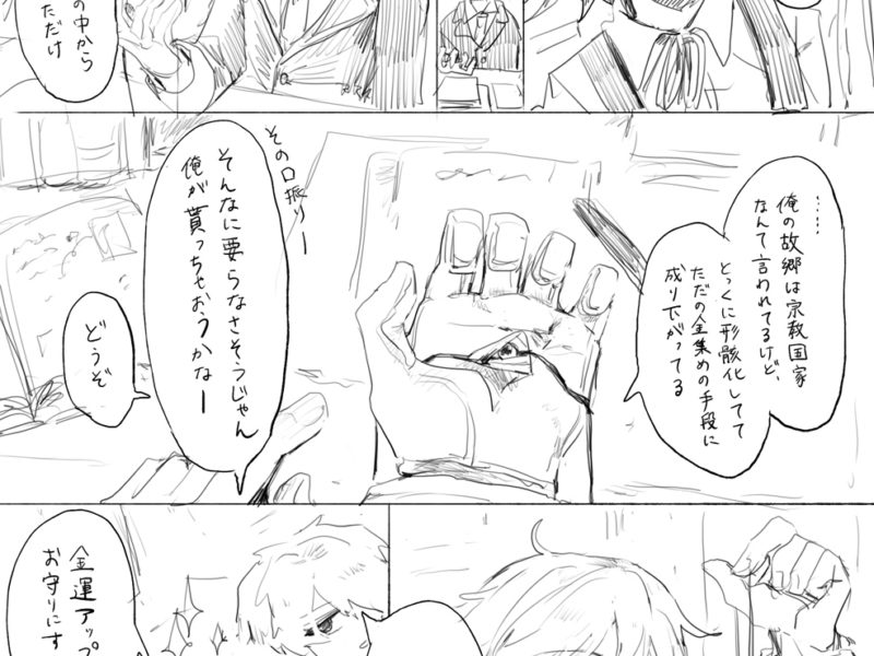 右手が左手になってしまった!ちゃんと下書きしないから〜 ちなみに組織のメンバーは宗教に対してどう考えてるかなと考えてみた。ヨナとティノは肯定的、シーラとハインツとフォルテはフラット(自身は興味無し)、ギルのみ小馬鹿にする …
