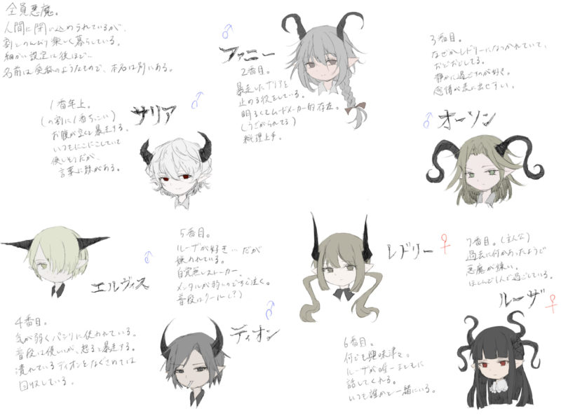 自分の創作はいつも殺伐してしまうので、ダークな世界観でほのぼのした創作をしようと思った。結局このキャラ設定を少し受け継いで殺伐とした。 角・尻尾・羽が生えていていかにも人外!という感じ。 が、世界観を練っていた際に悪魔と …